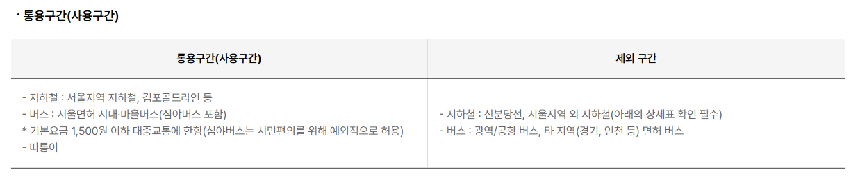 - 서울시 전역 지하철(1~9호선, 신림선·우이신설선 등) 및 서울 면허 시내·마을버스