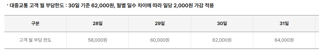 - 일반권 6만 2천원, 청년권(만 19~39세) 5만 5천원으로 서울 전역 및 일부 인접 도시에서 사용 가능 (따릉이 포함 시 최대 6만 5천원)