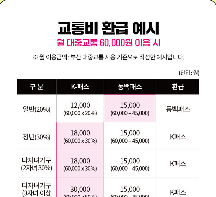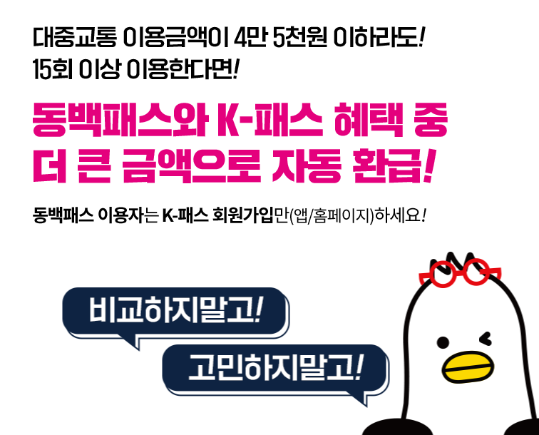 동백패스는 금액 기준, K패스는 이용 횟수와 대상별 비율 기준으로 환급이 이뤄집니다. 하지만 두 제도를 함께 가입하면, 매달 더 유리한 쪽으로 환급이 자동 적용되므로 부산 시민이라면 반드시 두 가지 모두 신청하는 것이 좋습니다.