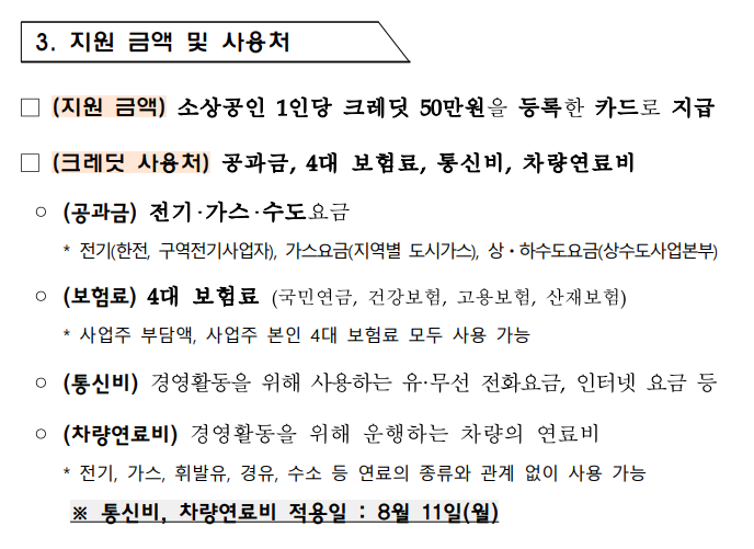기존에는 공과금과 4대 보험료만 가능했지만, 이제는 사업 운영에 필수적인 유·무선 요금, 인터넷 비용, 그리고 차량 운행 시 들어가는 연료비까지 활용할 수 있어 실질적인 고정비 경감 효과가 기대됩니다.