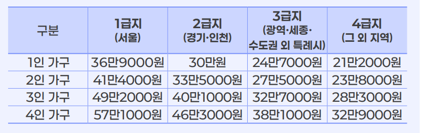 - 임차급여: 지역별·가구원 수별 기준임대료 상한 내 전월세 지원