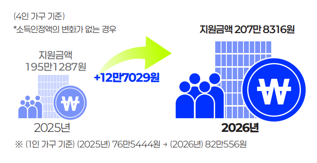 2026년 기준 중위소득이 6.51% 인상됩니다! 전 가구원 수에 따른 생계급여, 의료급여, 주거급여, 교육급여 수급 기준 및 지원금액을 한눈에 정리했습니다. 기초생활수급자 대상 확대 정보까지 꼼꼼히 담았습니다.
