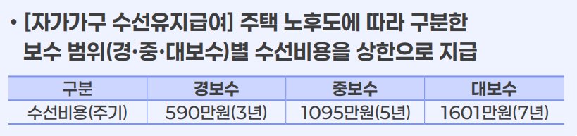 - 자가가구: 주택 노후도 따라 최대 1,601만 원 수선비 지원