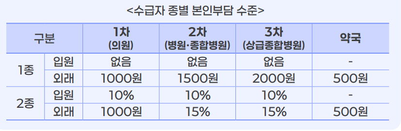 - 외래 진료비: 1종 1차 의원 1,000원, 3차 상급병원 2,000원